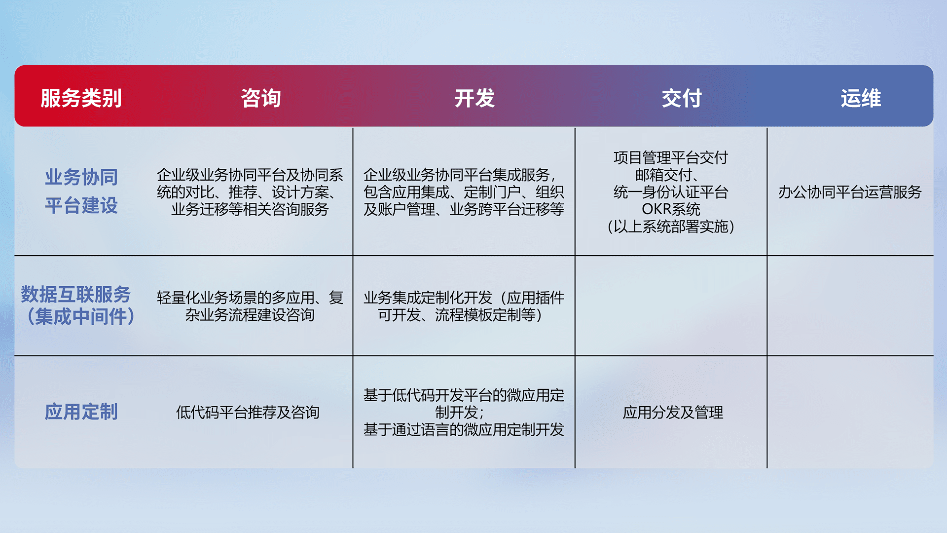 针对钉钉、、、企微、、、、IDaas等平台级产品提供产品的规划、、、方案、、交付、、、、定制化开发等服务,,,,实现如统一协同办公、、、、智能客户服务、、、、混合会议管理、、智能数据查询、、、等业务场景,,,实现数字化转型。。。